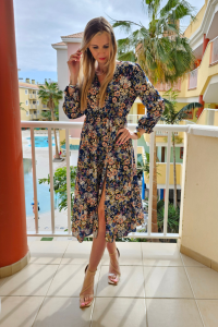 Granatowa sukienka midi z długim rękawem Emilia w kwiaty
