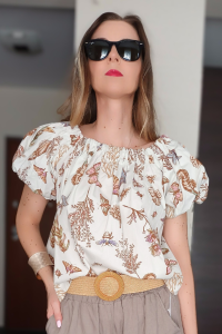 Bluzka Maristella to lekka, letnia propozycja z oryginalnym, morskim nadrukiem i fasonem hiszpanki. Odkryte ramiona, bufiasty rękaw i delikatna falbanka sprawiają, że każda stylizacja z jej udziałem nabiera dziewczęcego uroku i wakacyjnego luzu.