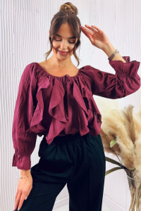 Burgundowa bluzka Alma to połączenie elegancji i swobody. Luźny krój zapewnia komfort, a efektowne falbany nadają całości lekkości i wyjątkowego modowego charakteru. Elastyczne mankiety subtelnie podkreślają nadgarstki, a dekolt typu hiszpanka pięknie eksponuje linię szyi. To idealny wybór zarówno do spodni z wysokim stanem, jak i spódnic midi.