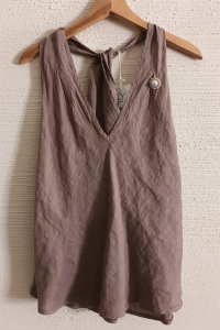 Top Luna to wyjątkowa propozycja dla kobiet, które cenią sobie styl, wygodę i szlachetne materiały. Uszyty z wysokiej jakości lnu, wyróżnia się lekkością, przewiewnością i niebanalnym krojem. Głęboki dekolt V z efektownym wiązaniem z tyłu oraz dekoracyjna broszka z perłą dodają mu subtelnego uroku w stylu vintage.