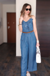 Ten lekki kombinezon jeansowy z długimi nogawkami to must-have na lato! Idealny dla kobiet, które cenią sobie wygodę, a jednocześnie chcą wyglądać stylowo i kobieco. Wykonany z przewiewnego, miękkiego jeansu, zapewnia komfort nawet w najbardziej upalne dni.