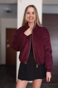 Kurtka bomberka Sofia burgundowa – zamszowa elegancja w sportowym wydaniu