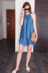 Regulowany dekolt wiązany na szyi subtelnie eksponuje ramiona i szyję, a marszczenie przy dekolcie dodaje całości lekkości. Dół wykończony falbaną nadaje sukience kobiecego, romantycznego charakteru.