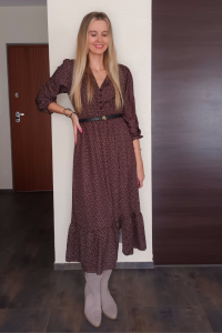 Brązowa sukienka w groszki to ponadczasowy wybór – świetnie prezentuje się z kozakami, ciężkimi botkami czy klasycznymi czółenkami. Wystarczy zmienić dodatki, aby za każdym razem stworzyć inną stylizację.