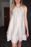 Regulowany dekolt wiązany na szyi subtelnie eksponuje ramiona i szyję, a marszczenie przy dekolcie dodaje całości lekkości. Dół wykończony falbaną nadaje sukience kobiecego, romantycznego charakteru.